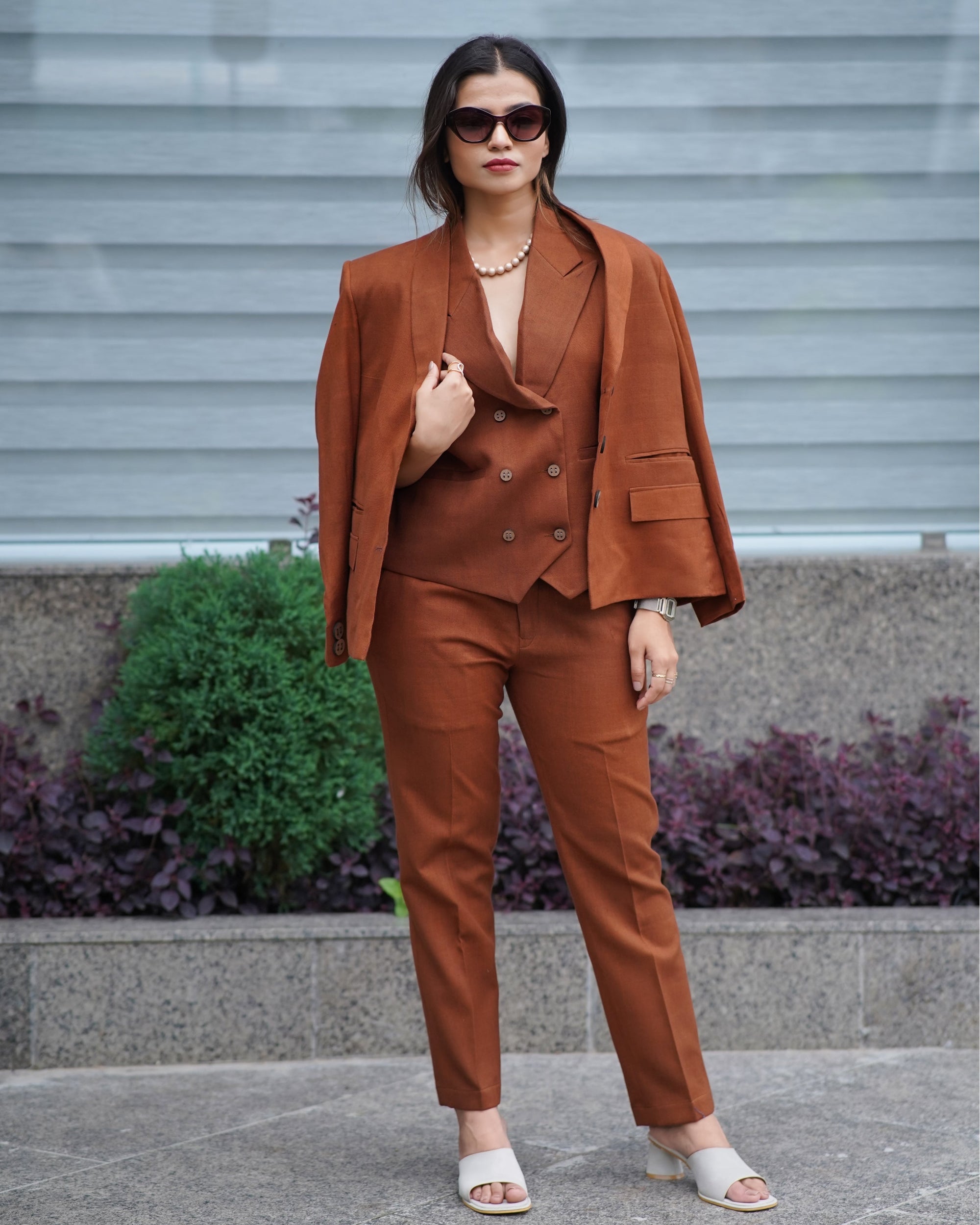 Elevate your wardrobe with this elegant 3-piece set, naturally dyed in rich cutch tones that offer earthy sophistication and sustainable charm. Crafted from a breathable and durable bamboo-cotton blend, the set includes a tailored blazer, waistcoat, and formal pants, making it ideal for refined, eco-conscious dressing.