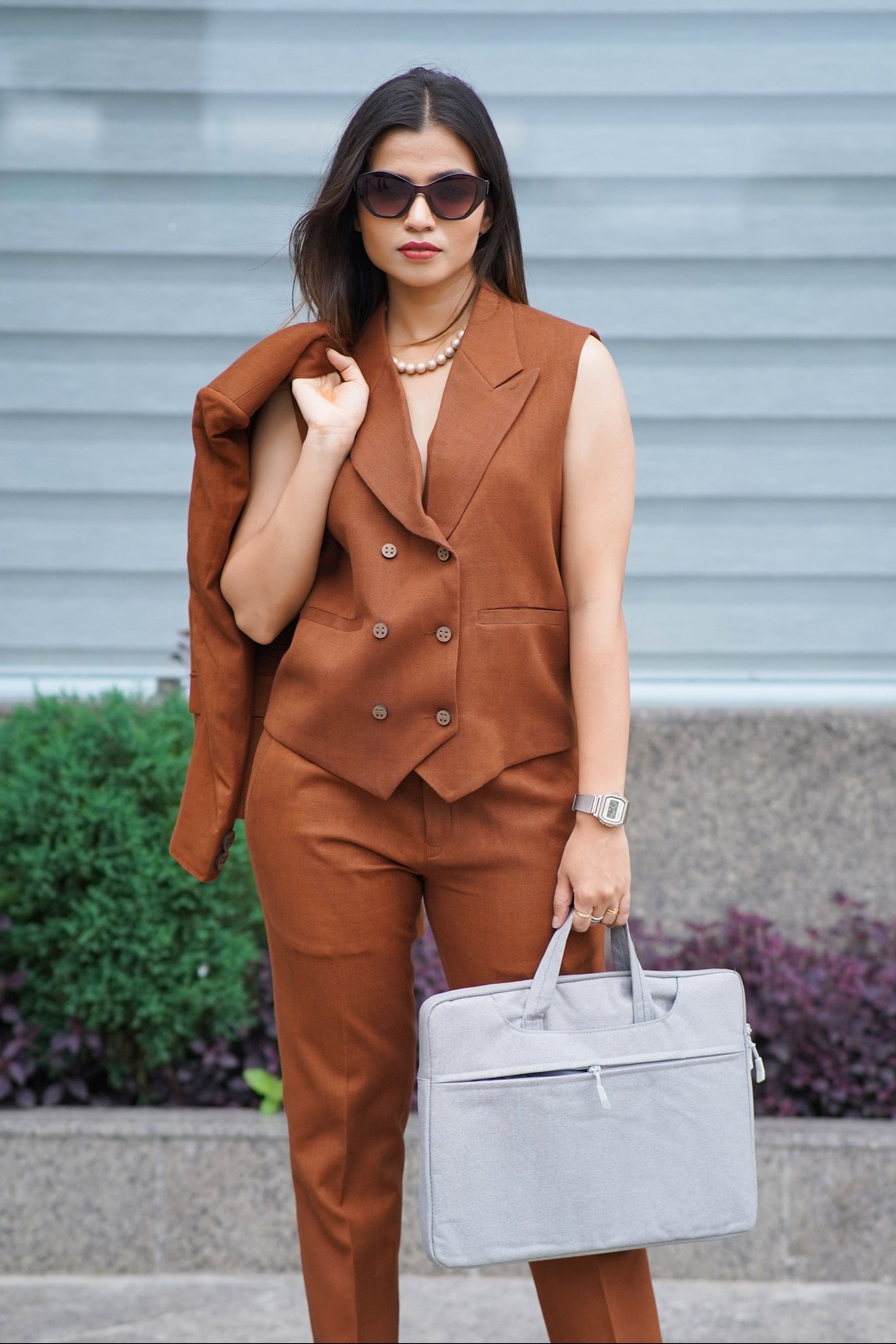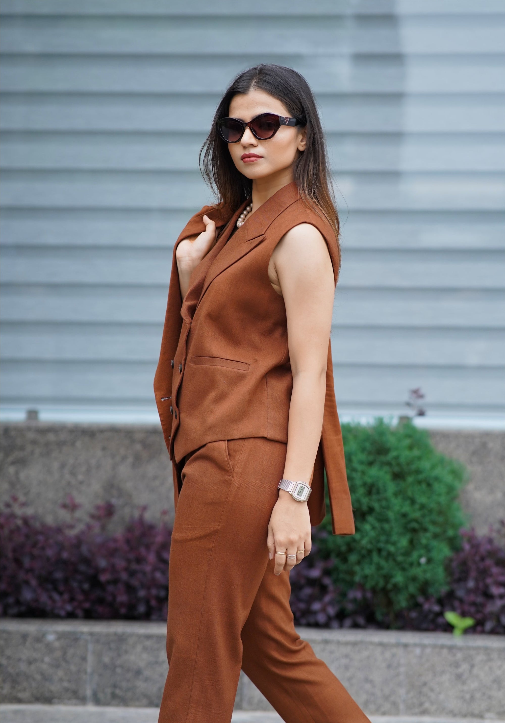 The blazer, cut for structure and comfort, serves as the centerpiece with its clean lines and natural sheen. The waistcoat adds a smart layering element, while the pants offer a modern formal fit for all-day ease. Each piece is dyed using cutch, a plant-based dye that gives warm, organic brown hues—free from harmful chemicals and rich in character.