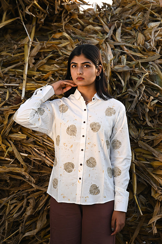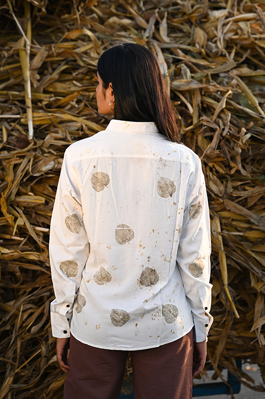 Crafted from ultra-soft, breathable bamboo fabric, this shirt celebrates nature through delicate peepal leaf impressions, each created using age-old natural dye techniques. The soft green hues are extracted from pteridophyte plants using an iron vat process with Harda (Terminalia chebula), resulting in subtle, earthy tones that honor both sustainability and craftsmanship.