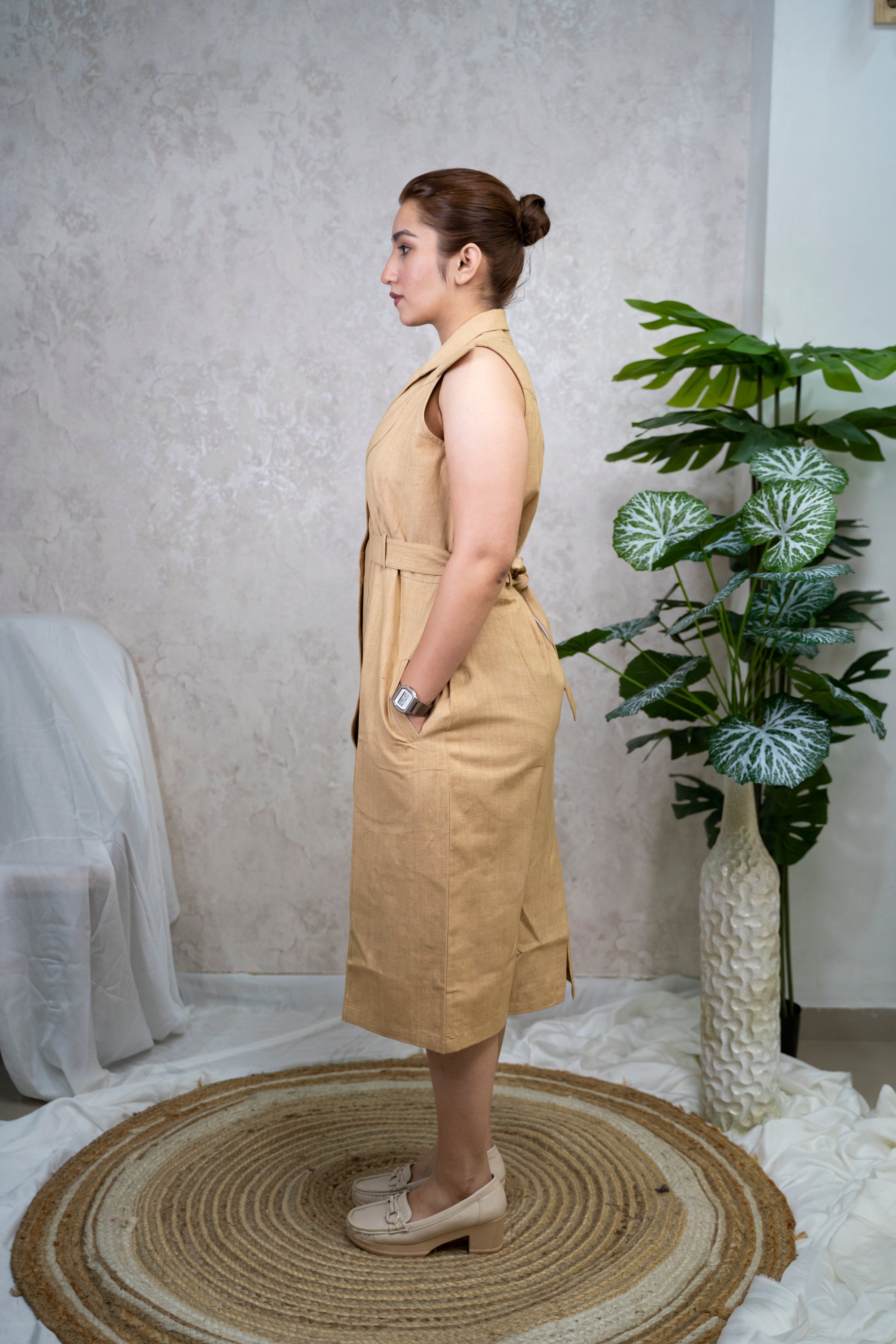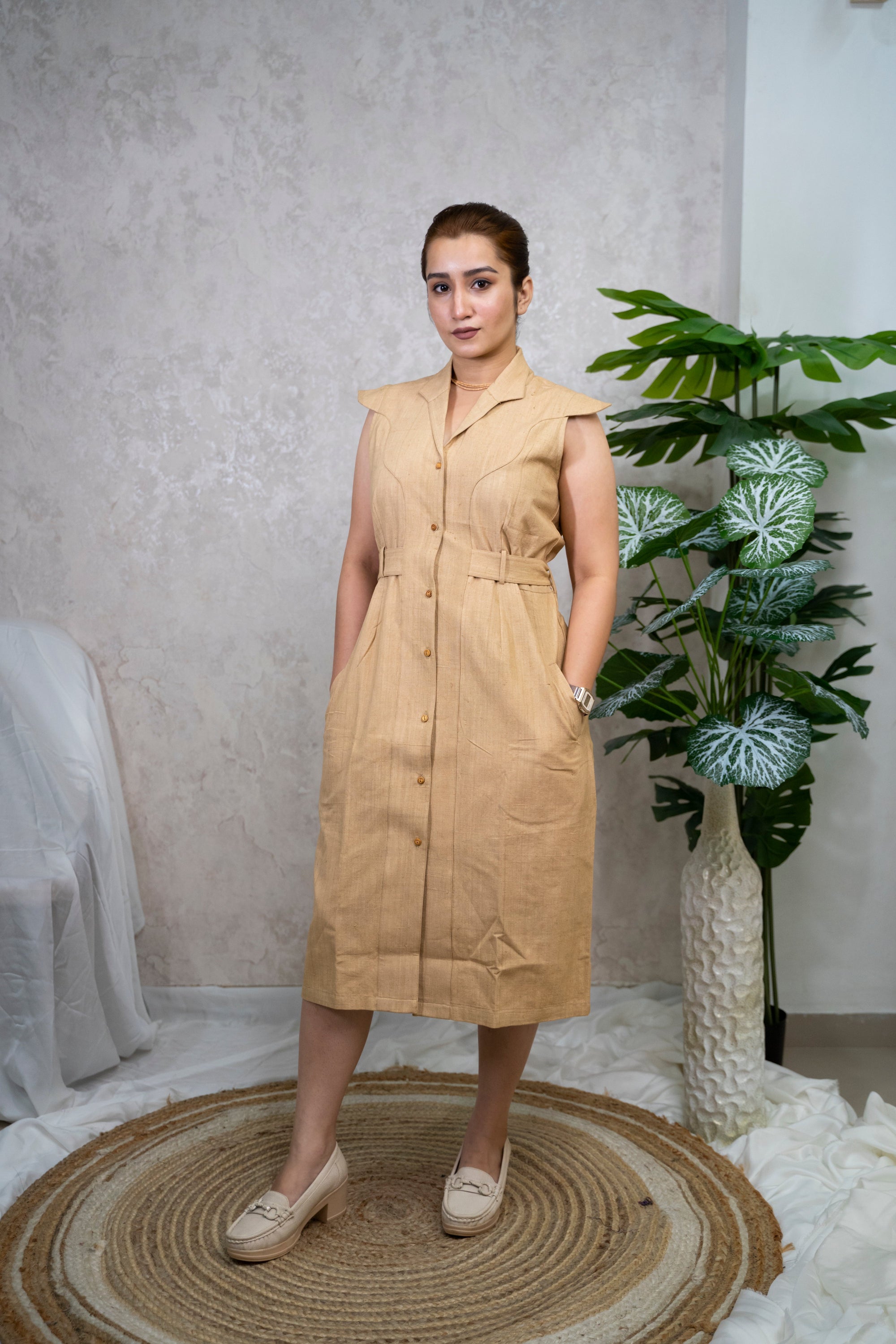Elevate your everyday elegance with the Beige Grace Midi Dress, crafted in a soft, neutral beige hue. This sleeveless, button-down midi dress features a pointed collar and a belted waist that flatters your silhouette. Designed for versatility, it effortlessly transitions from casual daytime outings to refined evening gatherings.