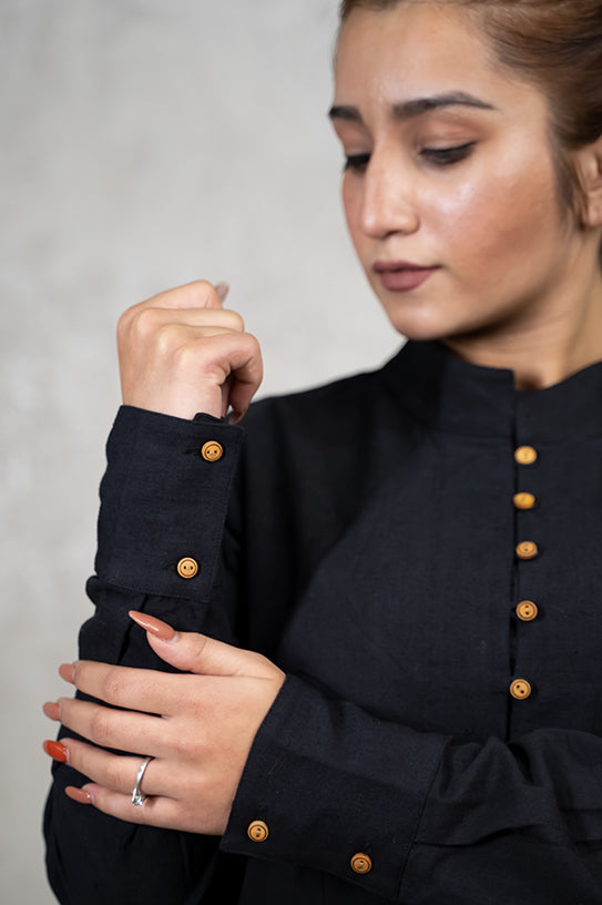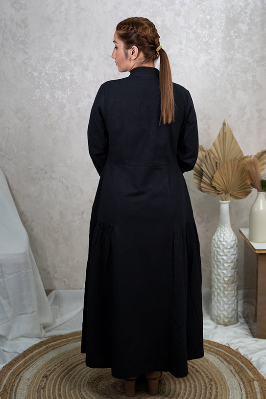 Subtle gathers below the baseline add gentle texture and graceful flow, enhancing its minimal yet elevated look. Whether you’re heading to a meeting or a mindful gathering, the Ebon Flow Dress offers effortless style and all-day comfort.