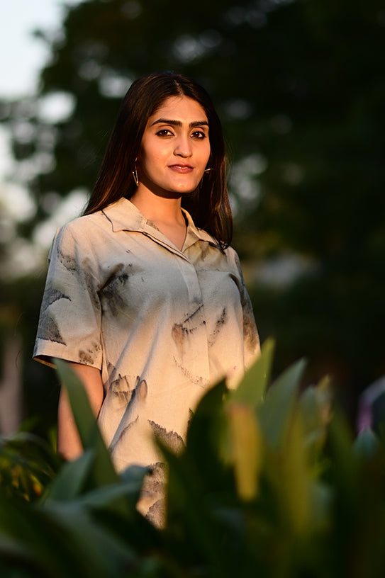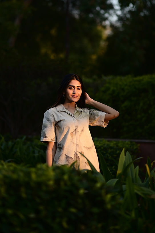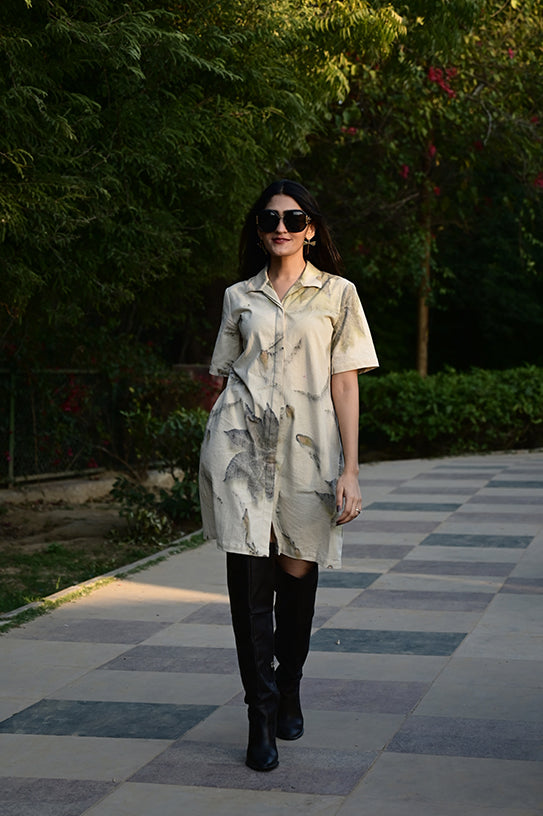 Reconnect with nature in our Whispers of Nature Short Dress, beautifully crafted from soft and sustainable Kala Cotton. This breezy silhouette features natural imprints of Oak and Eucalyptus leaves, each uniquely formed through eco-printing techniques that honor the essence of the Earth.