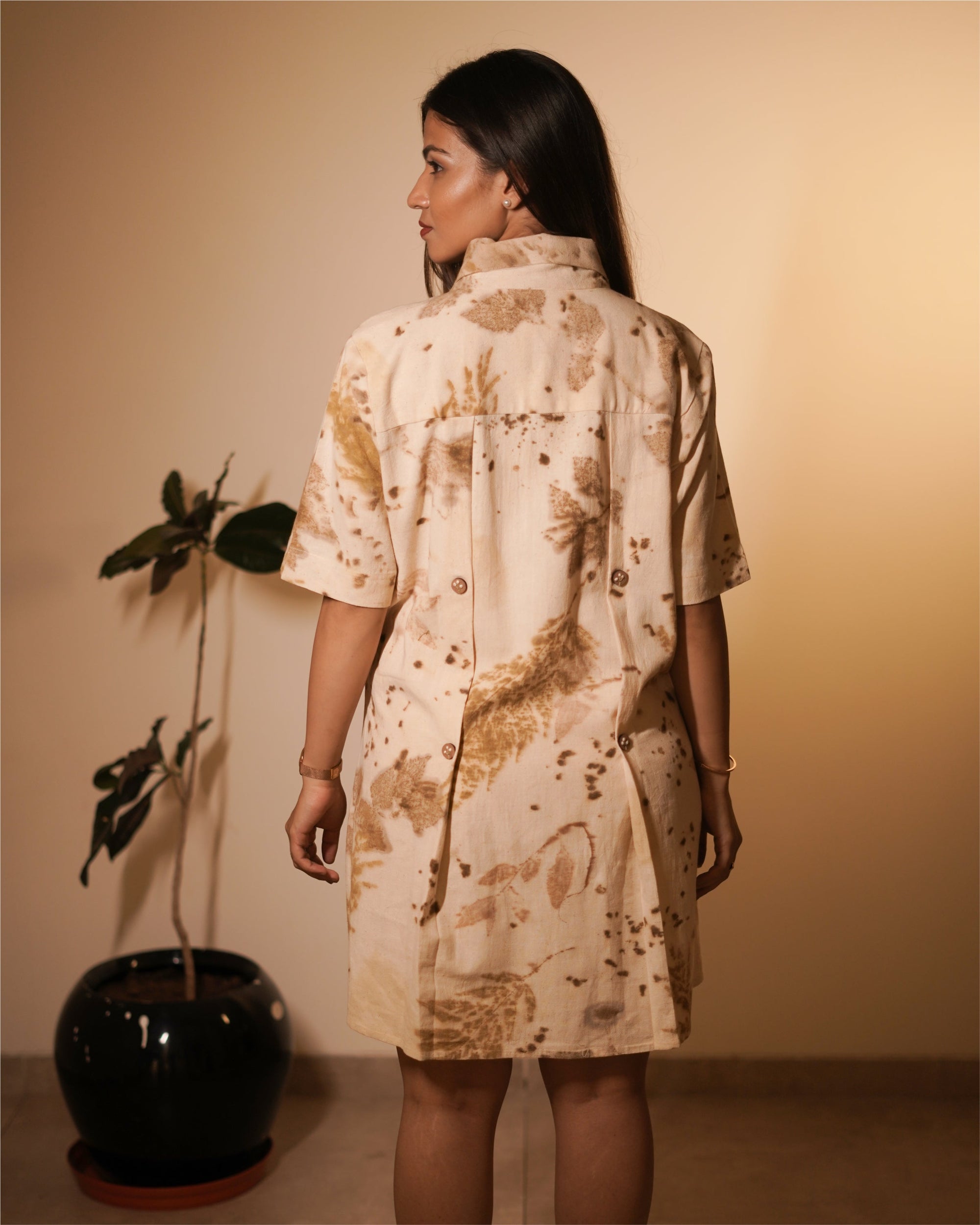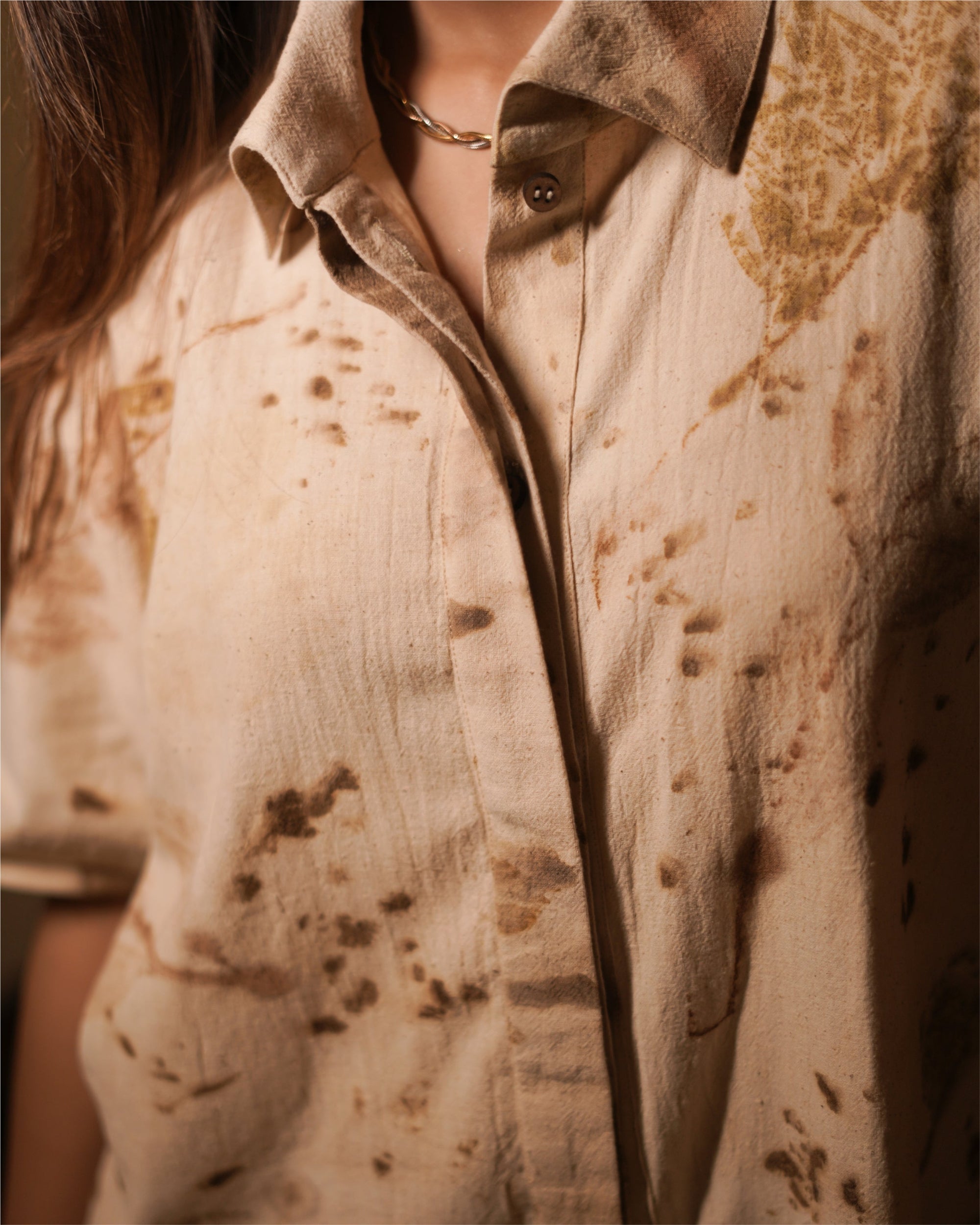 This minimalist piece features a clean shirt dress silhouette with invisible buttons down the front, offering a seamless, contemporary look. The highlight lies in its eco-printed leaf patterns — a delicate mix of real botanical imprints, each captured using natural dyes and sustainable processes. These earthy, organic forms tell a quiet story of nature’s artistry — no two dresses are ever the same.