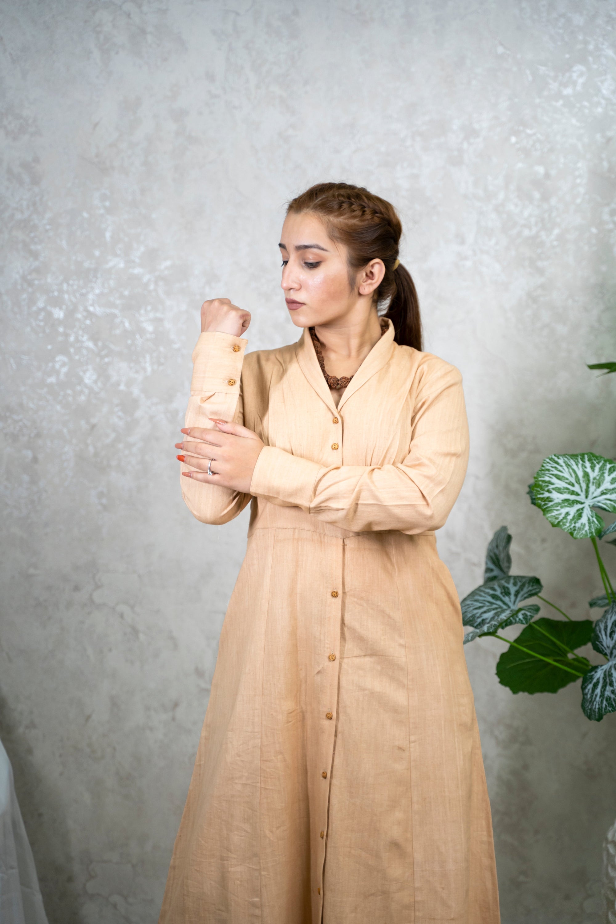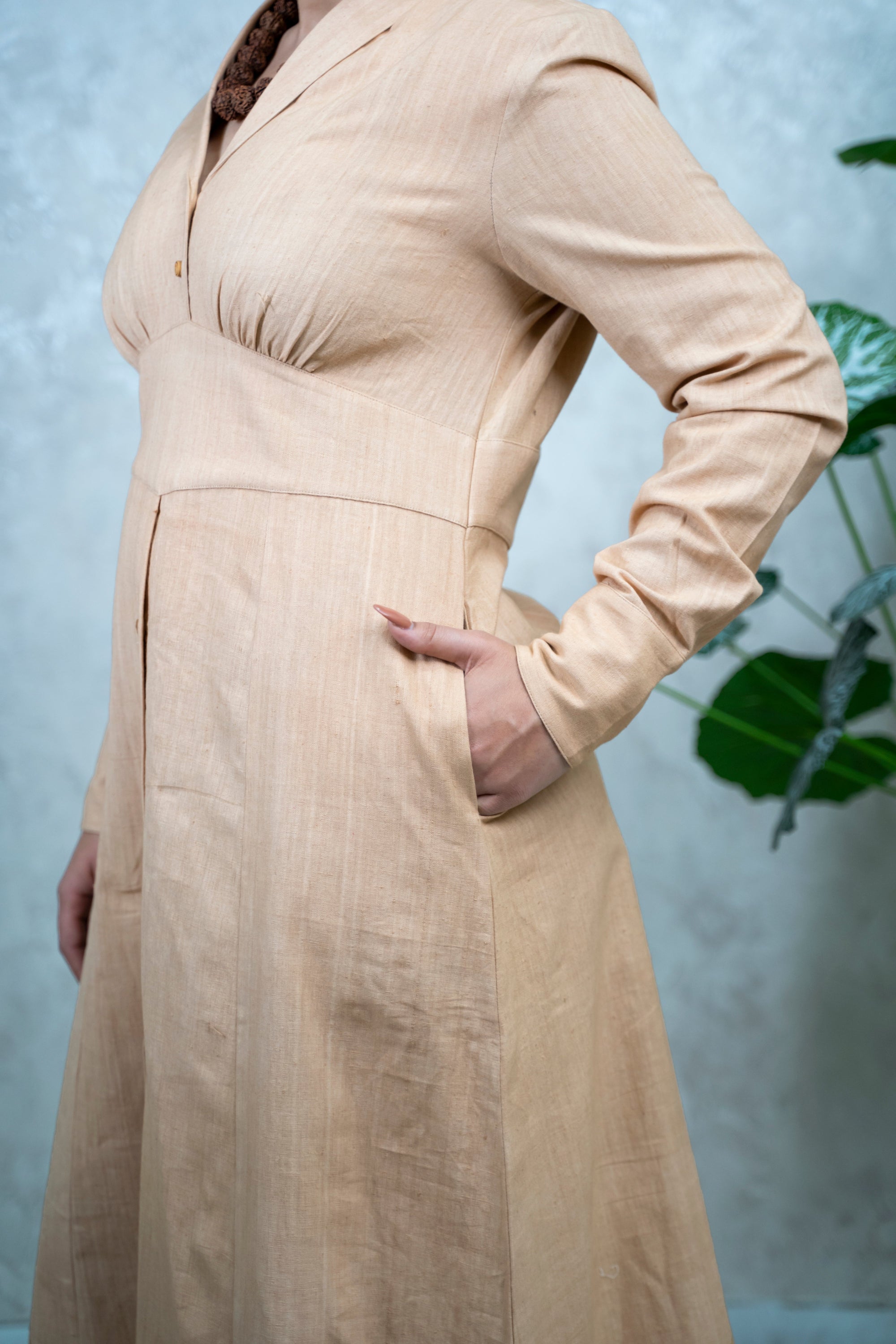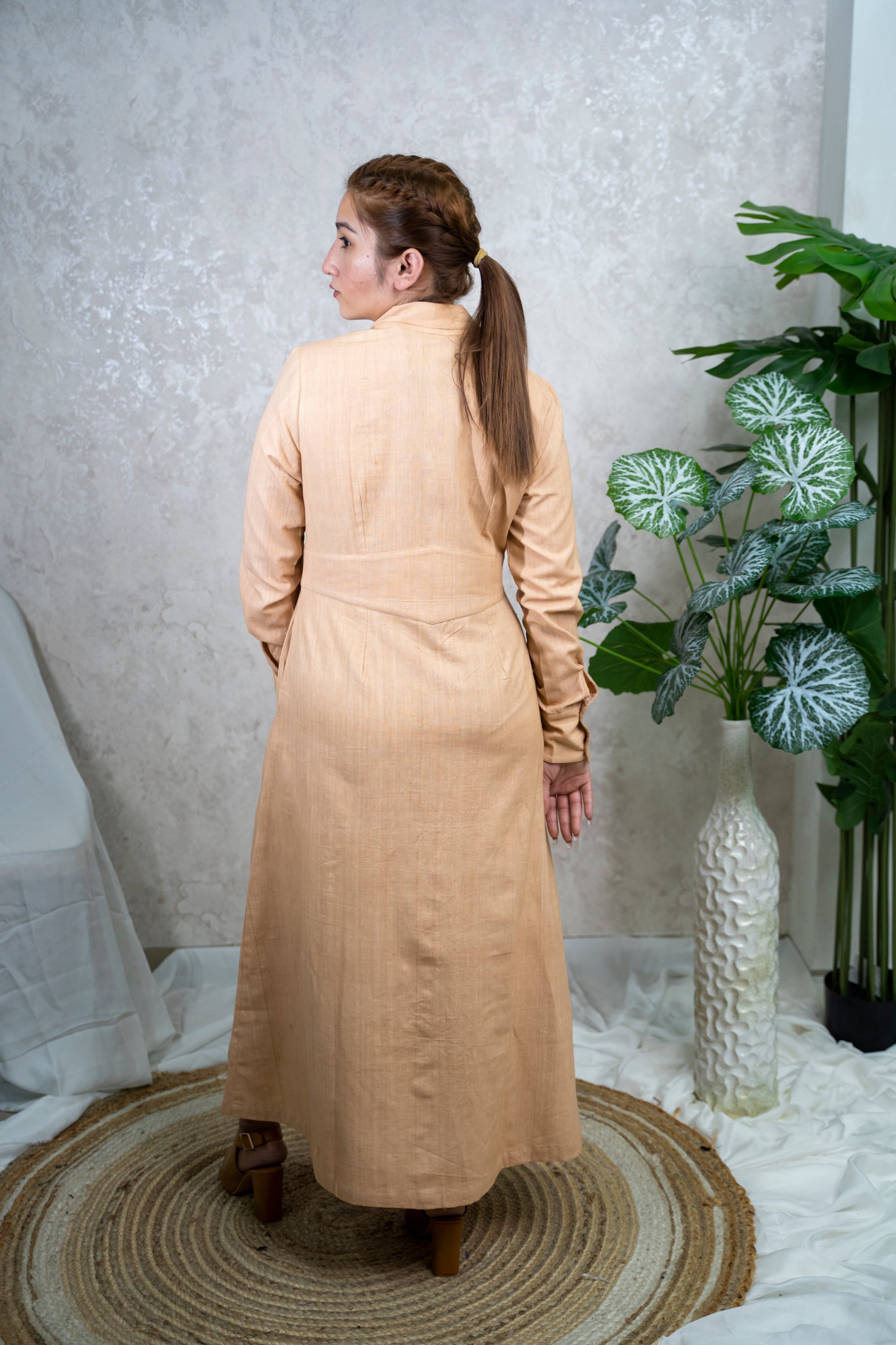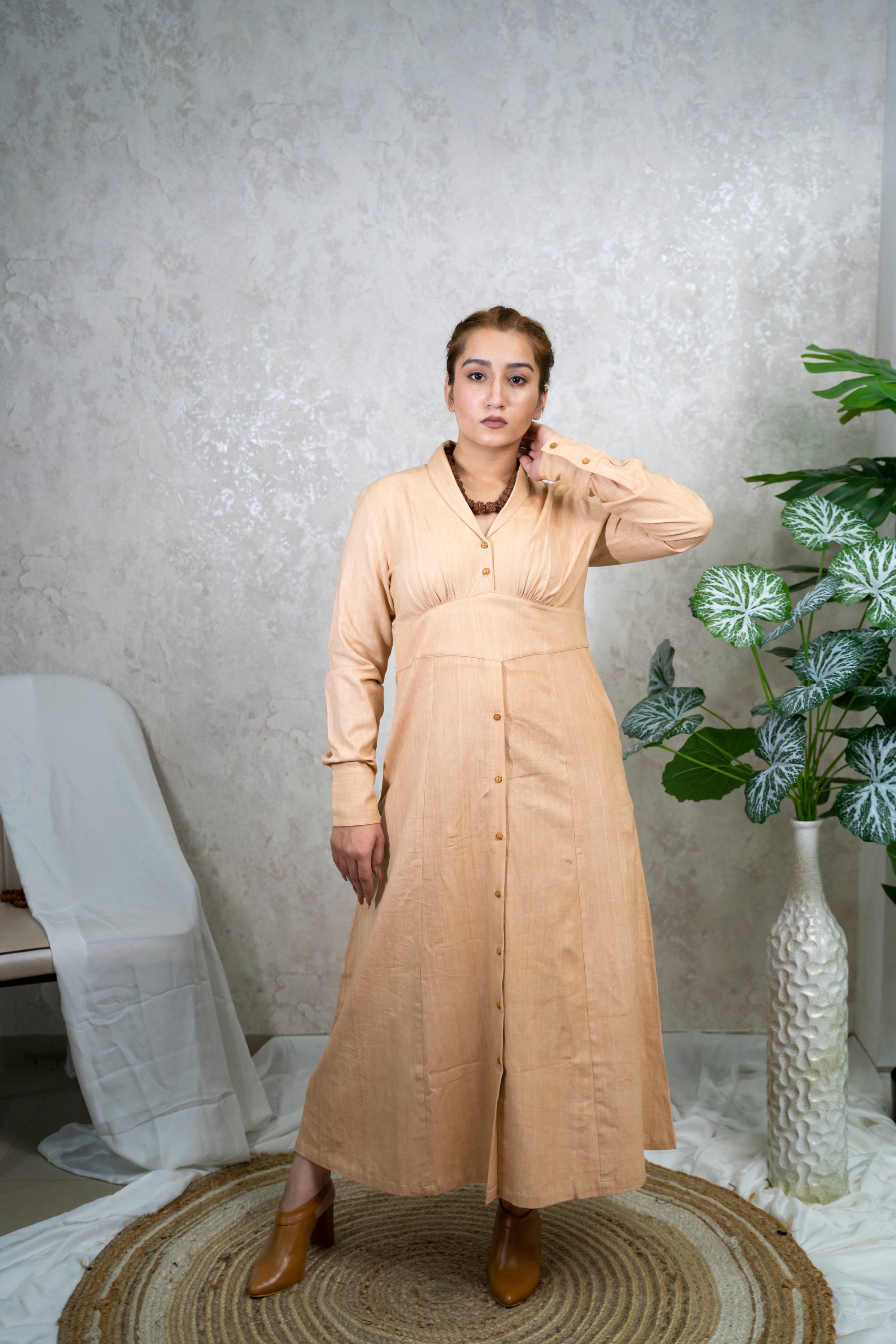 The dress features a clean button-down front that allows for effortless styling—wear it as a standalone piece or layer it as a chic overlay. Its earthy, neutral tone brings a sense of grounded sophistication, making it versatile enough for formal settings, work meetings, or relaxed gatherings.