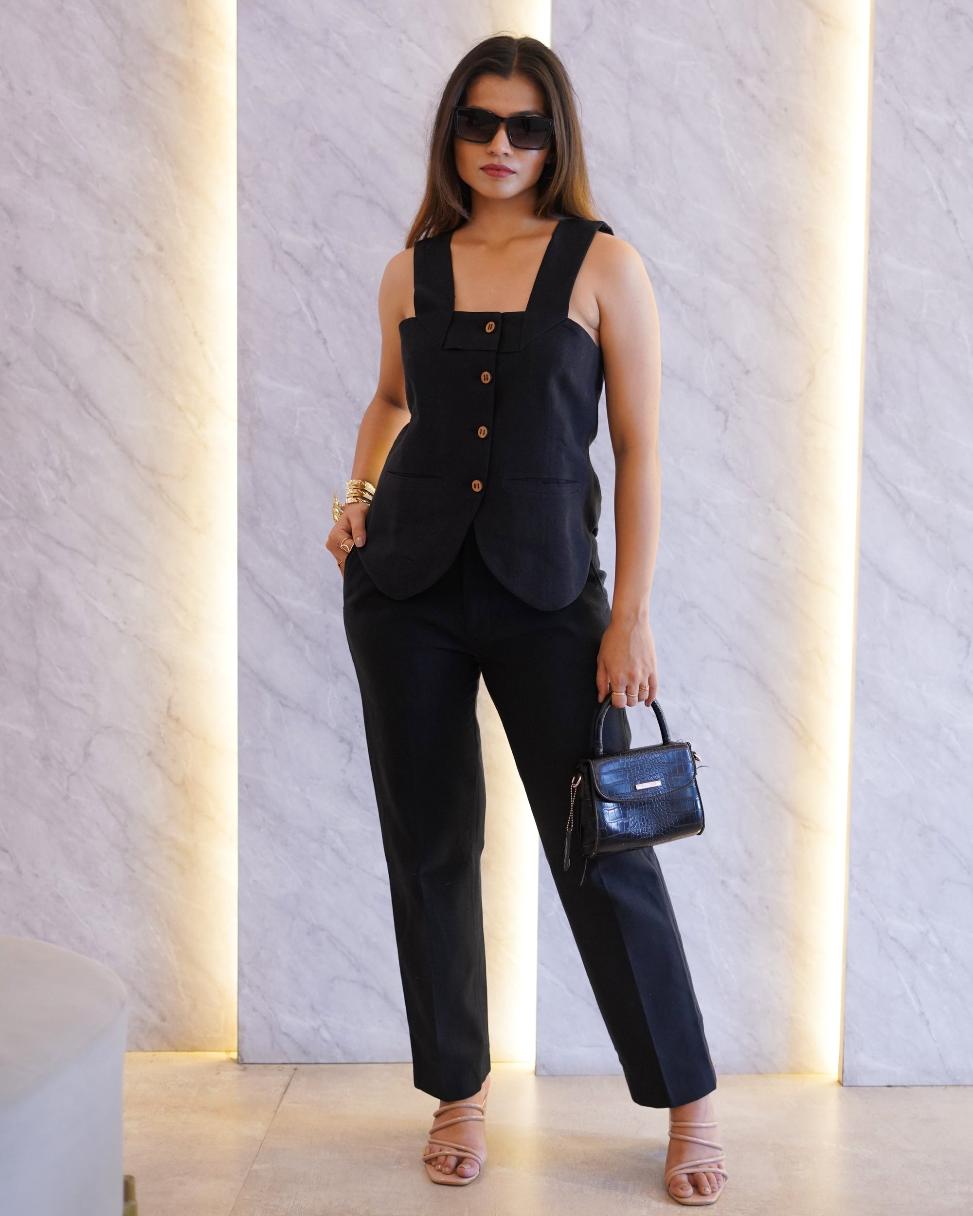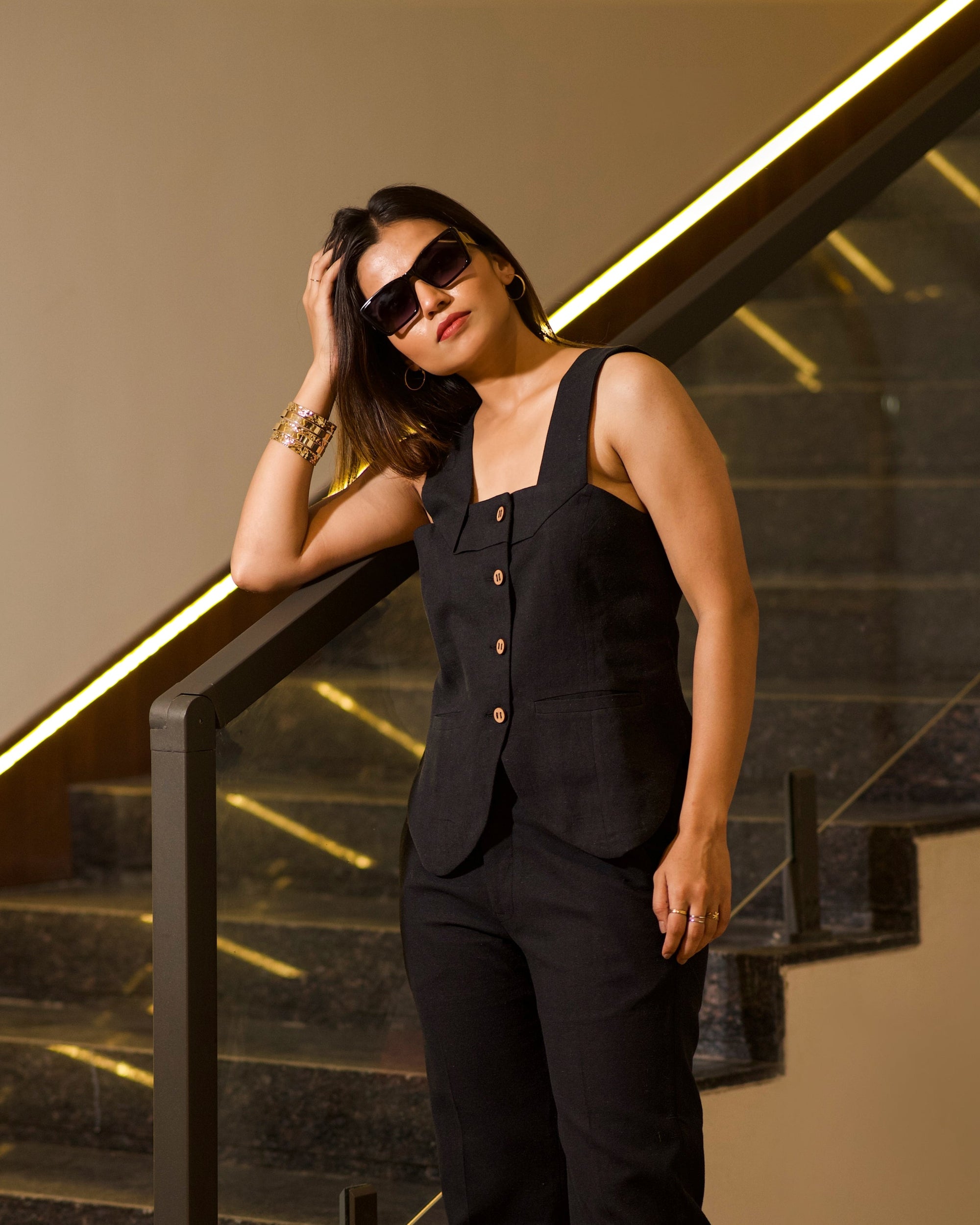 Crafted from eco-friendly Kala cotton, this sleek black waistcoat and formal pants set redefines modern formalwear with a sustainable edge. The strap-style waistcoat delivers a bold, contemporary silhouette, while the tailored pants ensure a sharp, comfortable fit.