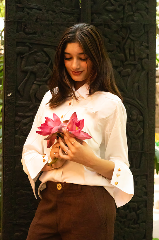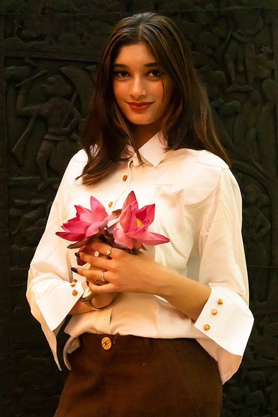 Infused with the grace of nature, this shirt is crafted from luxurious lotus fabric, celebrated for its rare blend of elegance, softness, and sustainability. Naturally breathable and lightweight, lotus fabric brings an ethereal quality to every wear.