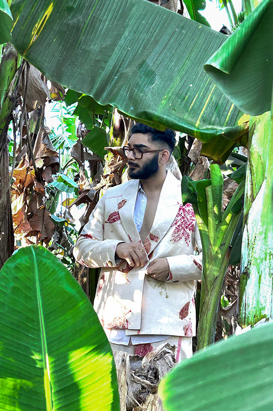 Make a bold statement with our eco-conscious men’s blazer, tailored from sustainably sourced fabric and hand eco-printed with real leaves. Featuring an ivory base adorned with earthy crimson botanical imprints, this blazer strikes the perfect balance between natural artistry and modern sophistication.