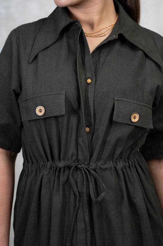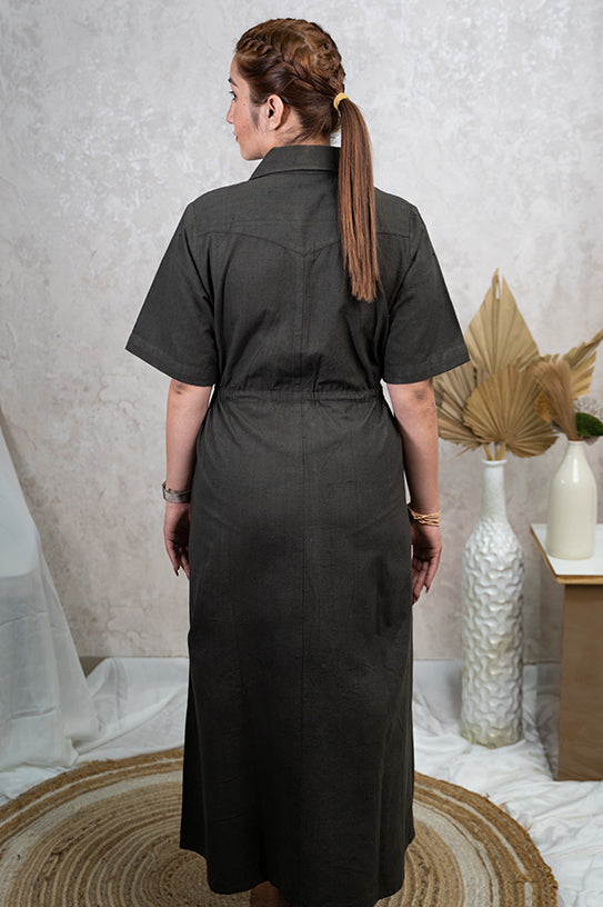 Rooted in calm and crafted for grace, the Olive Aura Dress is made from breathable handwoven khadi, reflecting balance, mindfulness, and modern sophistication. Designed with a tailored back yoke and a hidden placket, it blends structure with flow.
