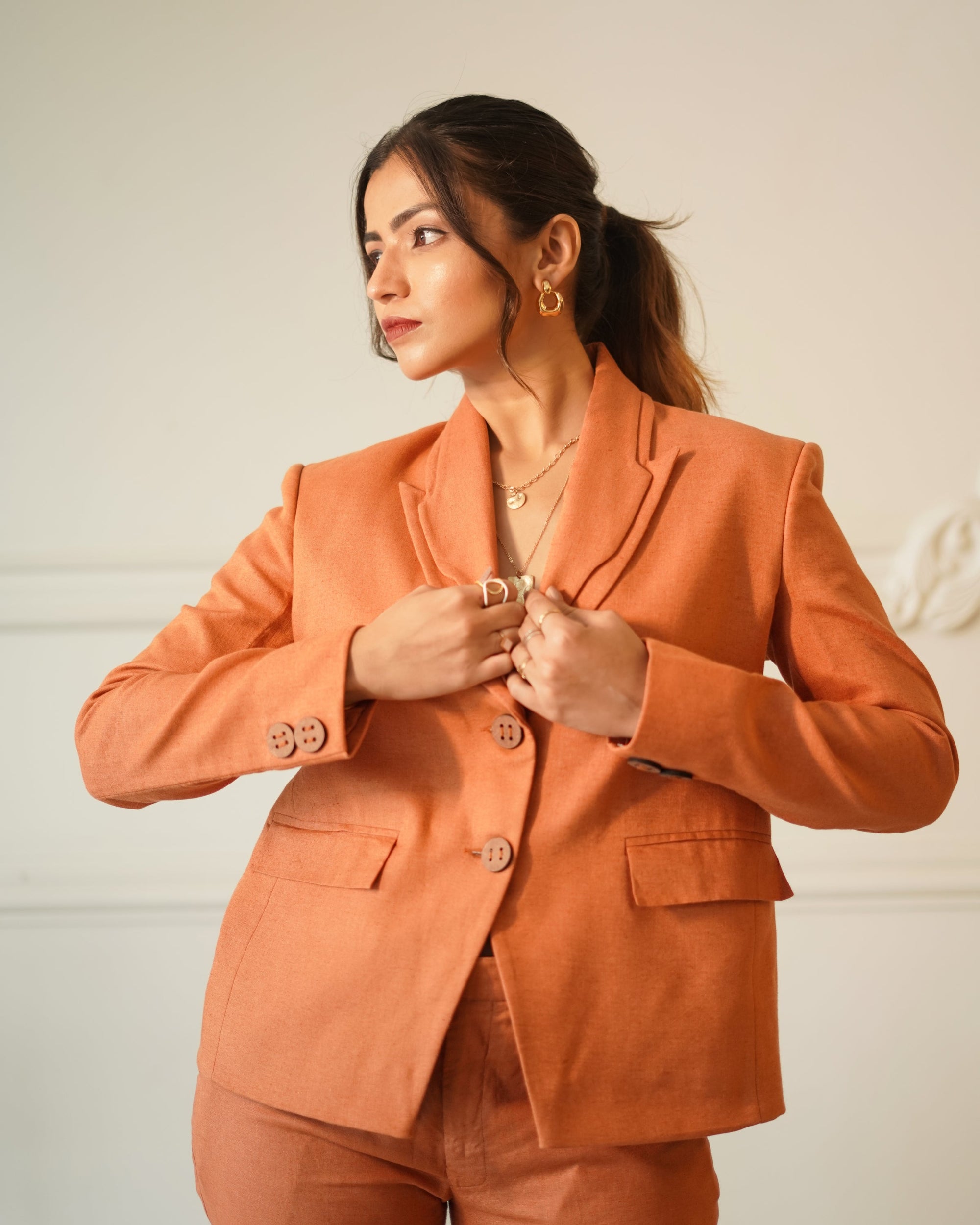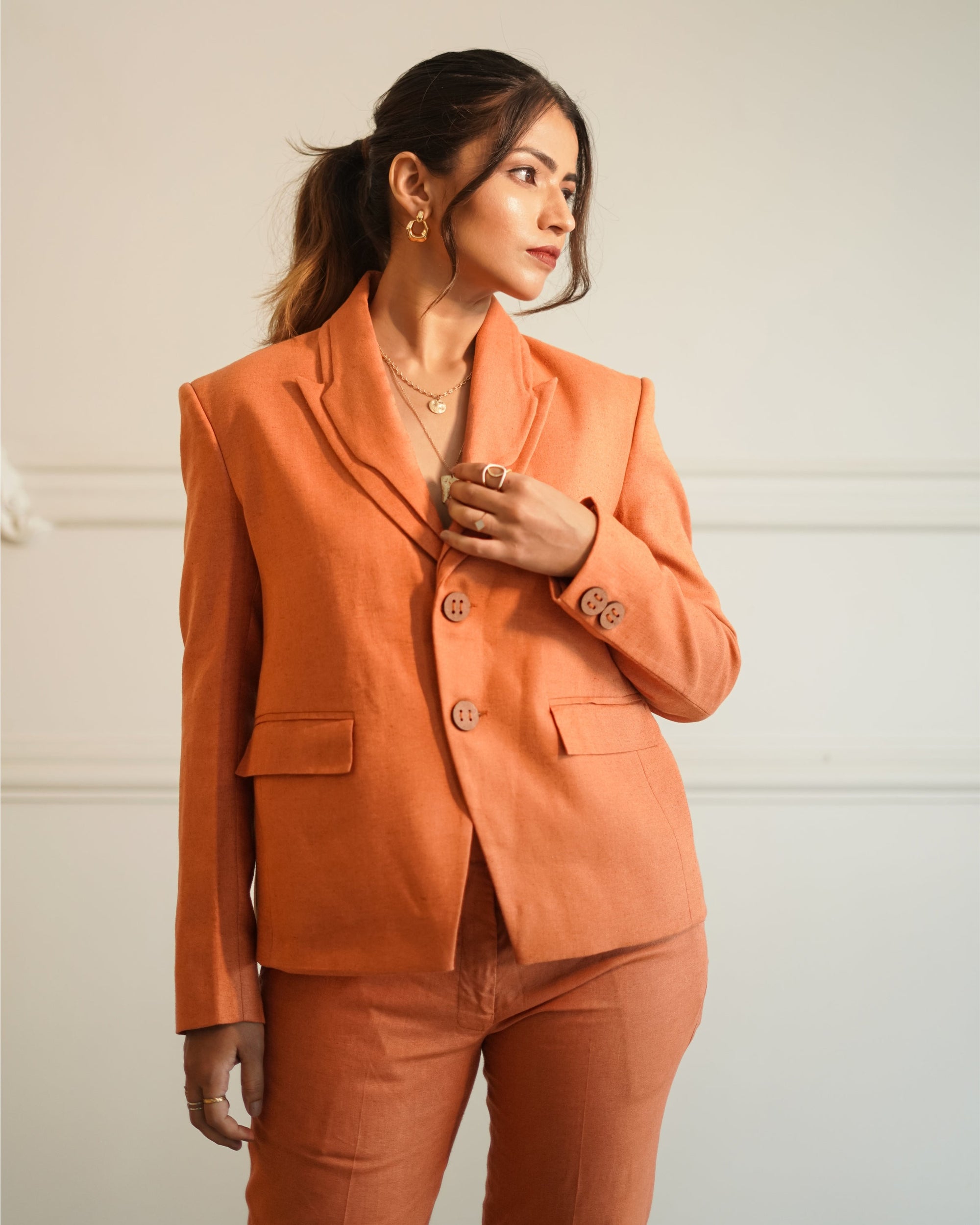 Rendered in a radiant burnt orange hue, this set is a modern-day essential for boardroom moments, creative showcases, or any space where style meets power. Wear it as a set or break it up — either way, this look delivers high impact with effortless ease.