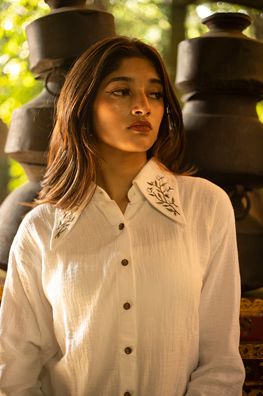 Where craftsmanship meets conscience. This beautifully tailored shirt is made from recycled gauze cotton, offering an incredibly soft, breathable texture that’s gentle on your skin and the planet. The standout feature? A bold, oversized collar embellished with delicate hand embroidery, turning this wardrobe staple into a statement piece.