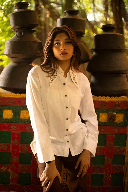 Designed for the modern woman who values individuality and sustainability, this shirt effortlessly blends minimal design with artistic detail. Ideal for brunches, creative workspaces, or evenings out — this is slow fashion that speaks volumes.