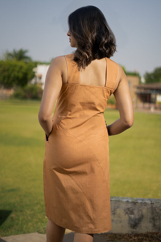 Effortless and evocative, the Roll the Calm dress draws inspiration from the carefree joy of childhood dice games — moments of quiet excitement, simple pleasures, and the gentle rhythm of play. Crafted in a warm Camel Tan hue, this piece features a minimal shift silhouette elevated by an asymmetrical strap and a front slit, adding modern edge to a relaxed design.