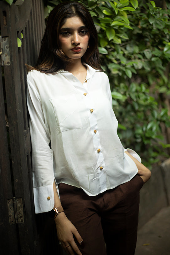 Minimal from the front and a canvas of artistry from the side, this piece bridges modern silhouettes with conscious detailing. Designed for the discerning woman who values sustainability, elegance, and storytelling, this shirt transitions beautifully from boardroom to boutique cafés.