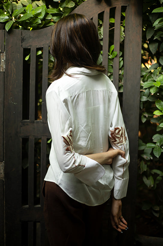 A shirt that tells a story of nature and nuance. Crafted from innovative rose fabric, this white shirt offers a soft, flowy drape and a sustainable edge. On the back side of each sleeve, from elbow to cuff, lies its true charm — delicately hand-embroidered rose motifs, brought to life with French knots in warm, earthy tones.