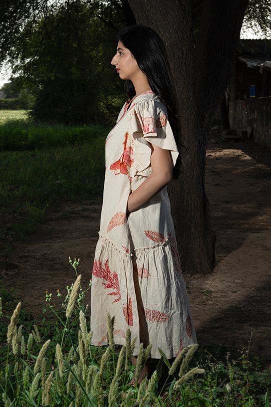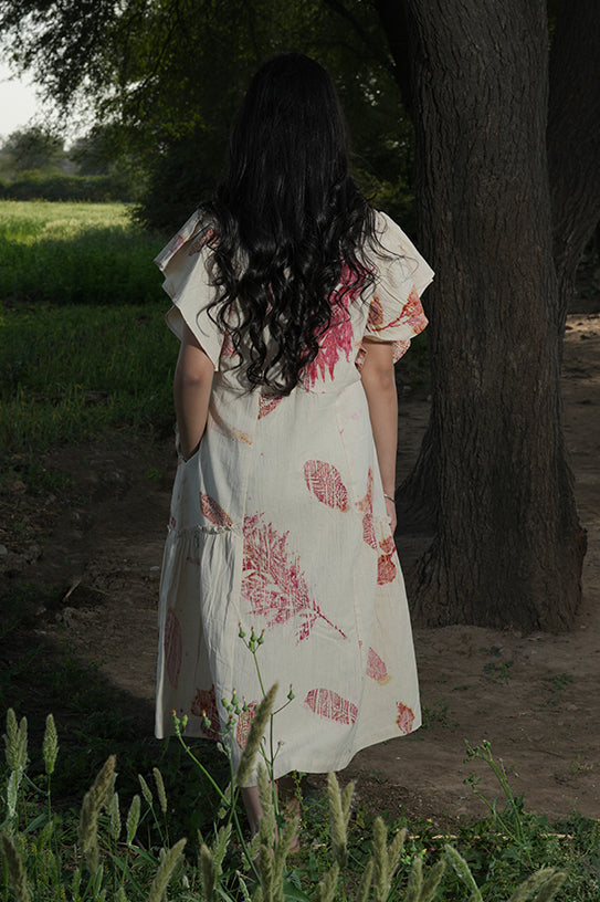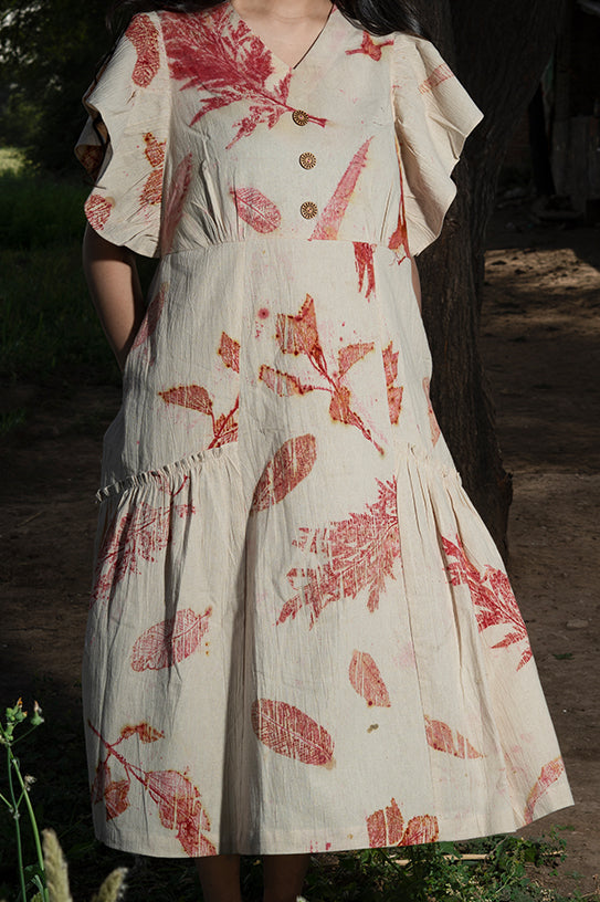 Effortlessly elegant and deeply rooted in nature, the Rustic Bloom Maxi Dress is crafted from soft organic cotton and eco-printed using oat and eupatorium leaves. The earthy imprints celebrate the quiet beauty of foliage, turning each dress into a one-of-a-kind canvas of botanical art.