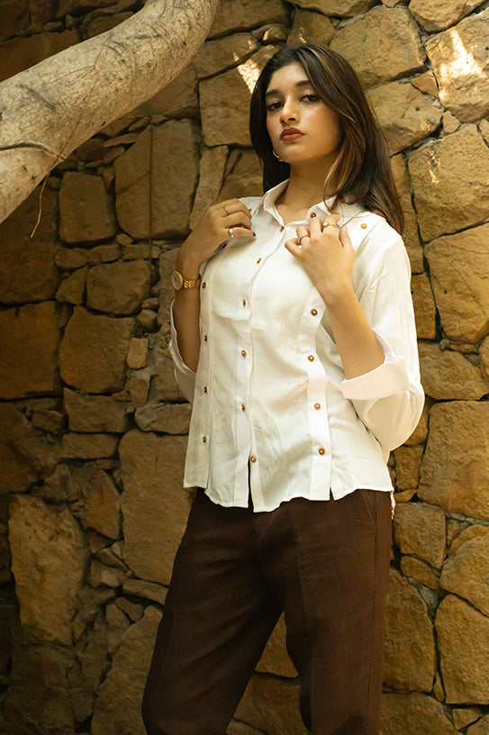 Crafted from ultra-soft, sustainable milk fabric, this white shirt redefines everyday elegance with a modern twist. The design features a symmetrical triple placket—one at the center and two running from mid-shoulders down the front and back—creating a striking yet balanced silhouette.