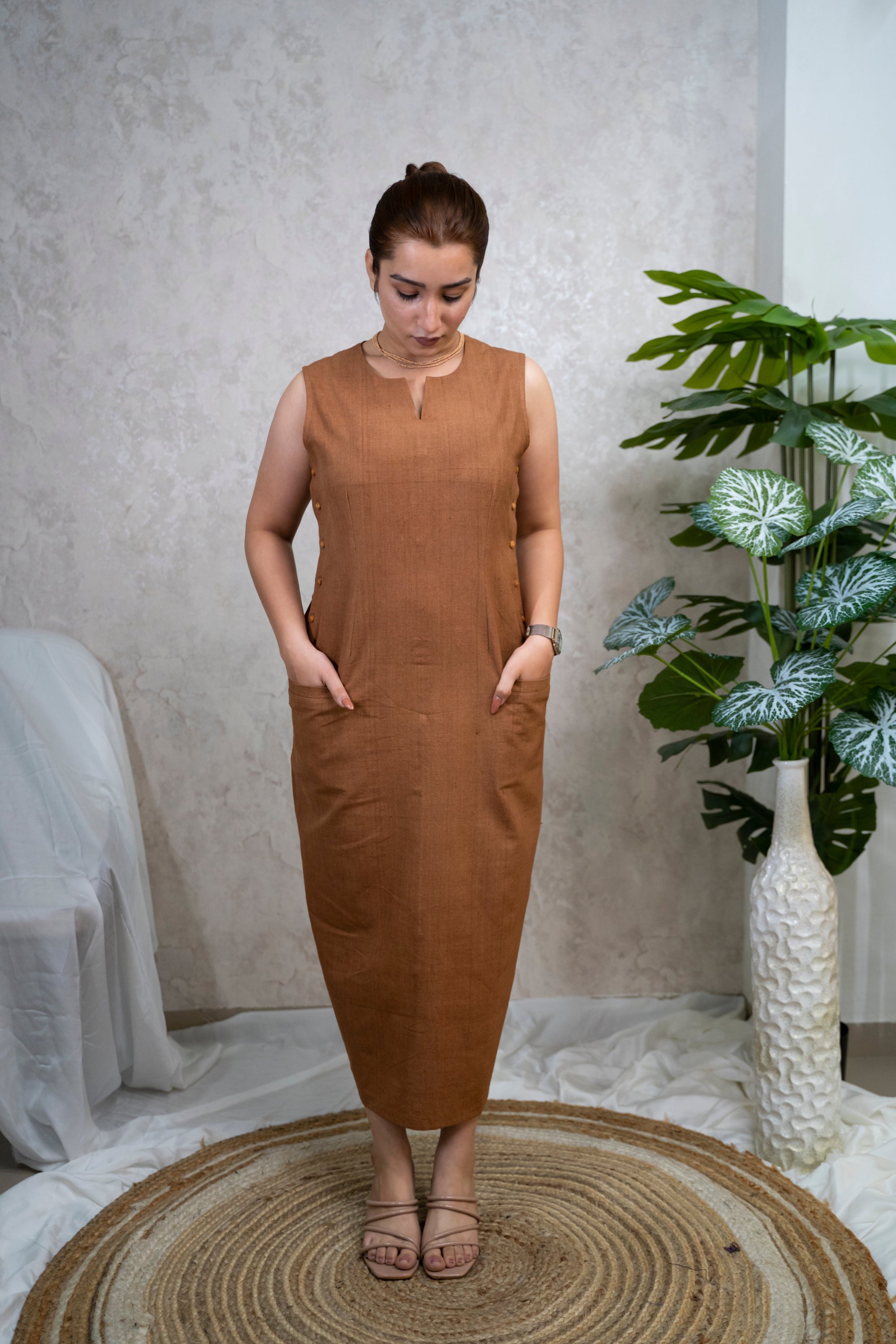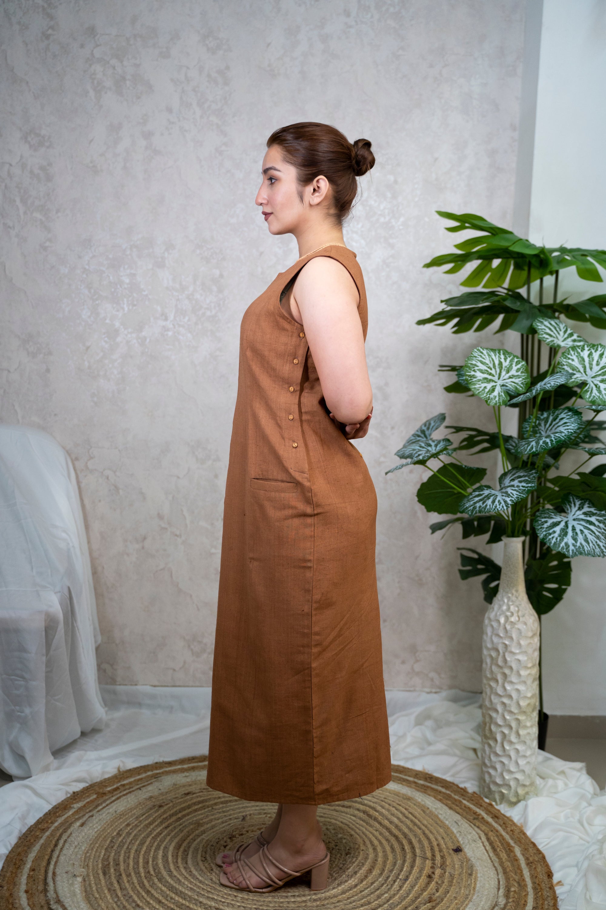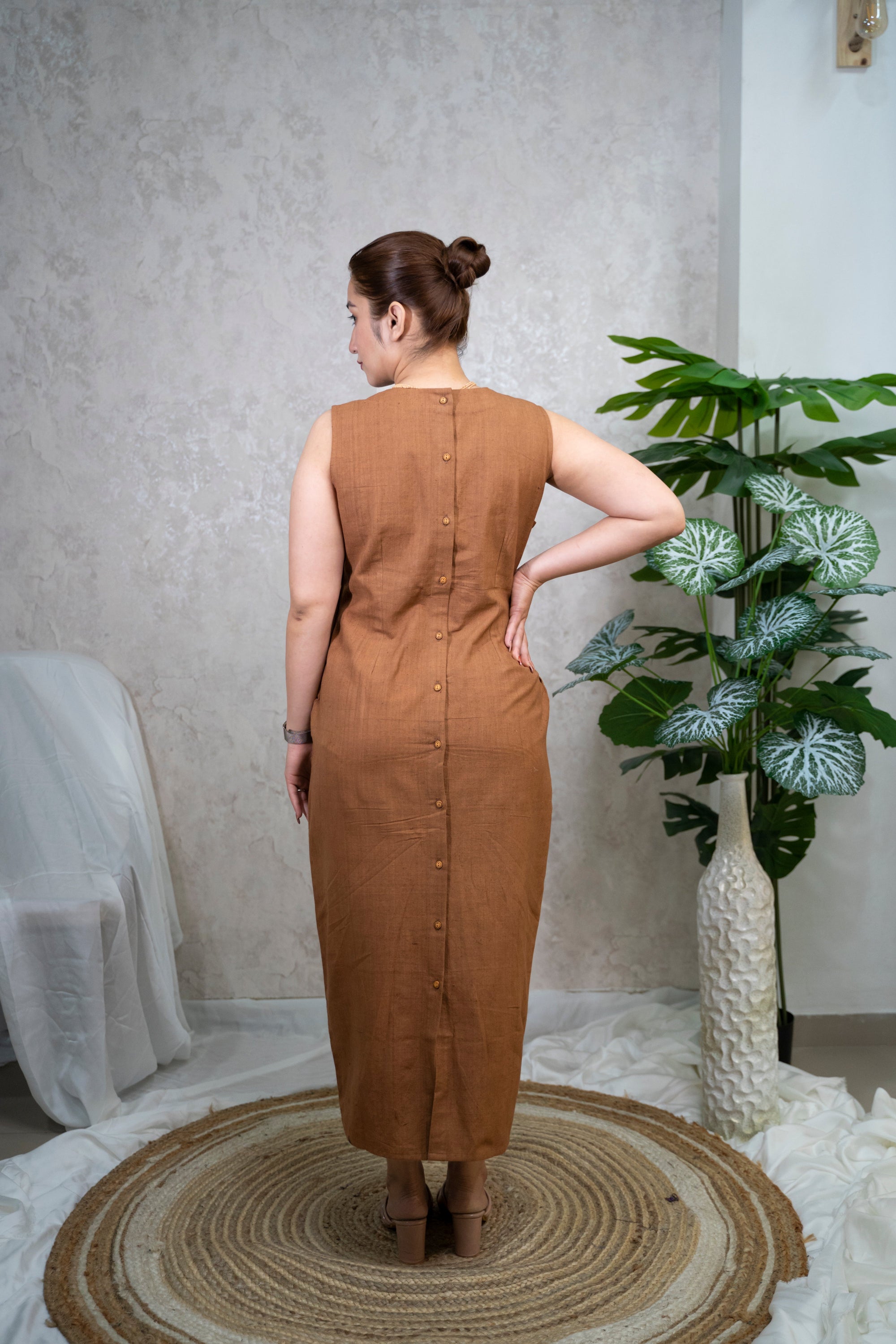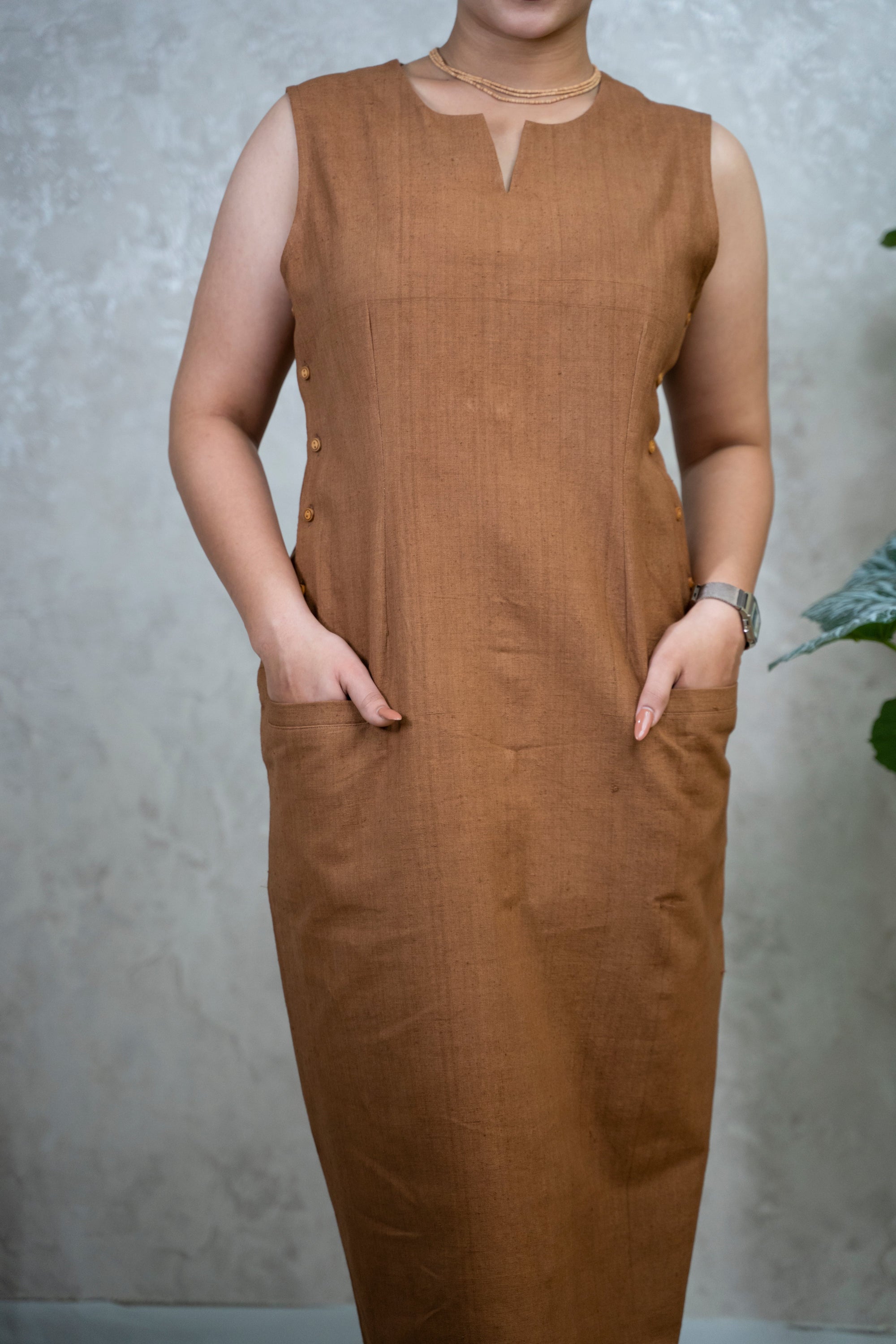Thoughtfully designed for both style and utility, the dress includes two hidden side pockets and a distinctive center back placket that extends from the neck to the hem, adding a subtle architectural flair. Perfect for warm days or layered looks, it’s a versatile piece for any occasion.