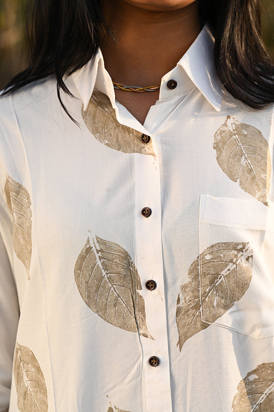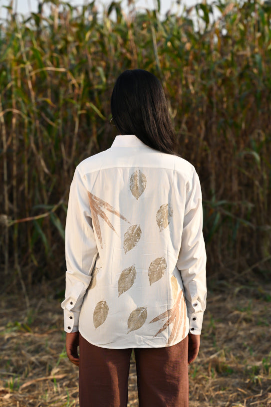 Crafted from luxuriously soft and sustainable bamboo fabric, this shirt features hand-applied impressions of Silver Oak and Almond leaves, capturing nature’s artistry in every fold. The earthy brown tones are achieved through a rich blend of natural dyes—including madder, wood flower, iron earth, and sea salt—while the green hues come from an iron vat dyeing process with Harda (Terminalia chebula).